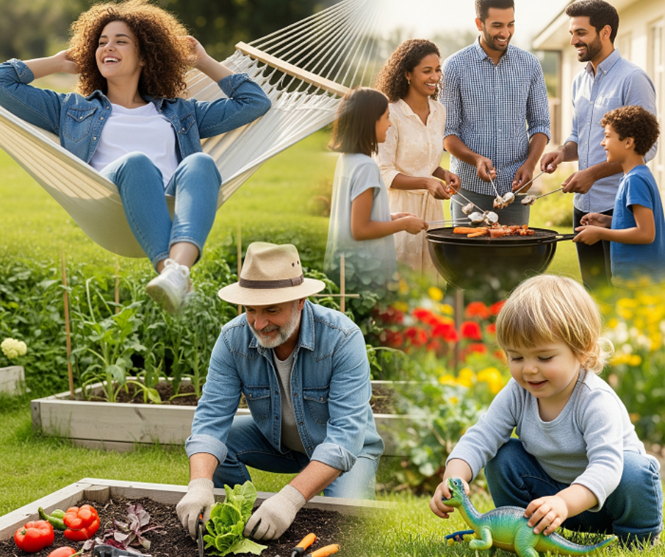 - Espaço para Crianças/Animais: Um gramado para correr, uma caixa de areia, uma horta infantil, uma área sombreada para o pet.