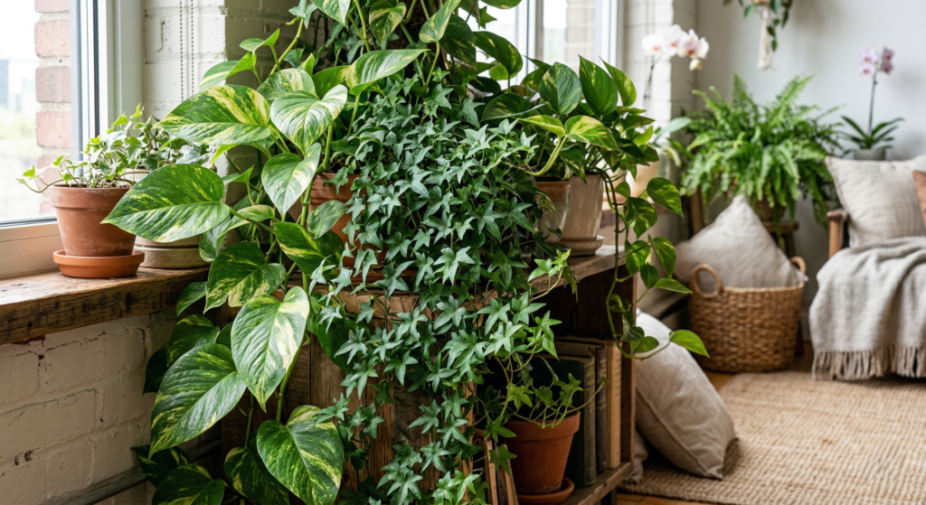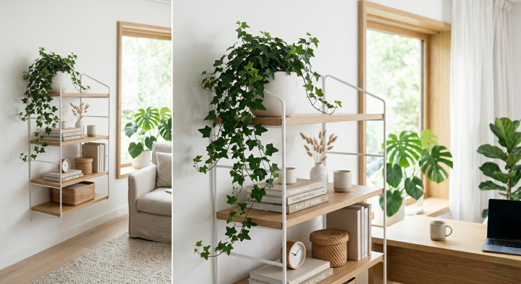 - Escandinavo Contemporâneo: Em ambientes minimalistas e de tons neutros, uma hera inglesa caindo suavemente da prateleira mais alta de uma estante de metal ou madeira clara adiciona o toque exato de cor e vida, sem quebrar a leveza do espaço.