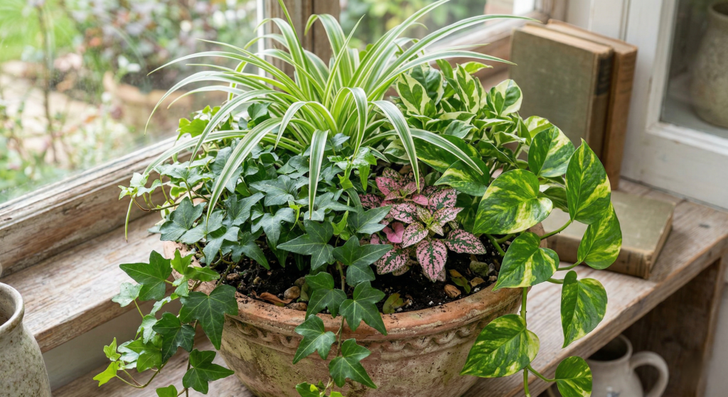 Se você gosta de criar composições mistas no mesmo vaso (uma técnica muito charmosa no paisagismo), a hera inglesa é uma excelente planta de preenchimento ou “spiller” (aquela que transborda e derrama pelas bordas do arranjo). Ao escolher plantas companheiras, o segredo do sucesso é agrupar espécies que tenham exatamente as mesmas necessidades de água e luz.